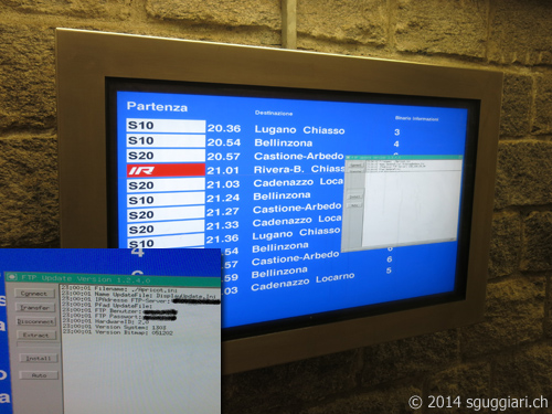 Permalink a questo articolo. 24 FEBBRAIOTabelloni elettronici FFSÈ di oggi la notizia che le FFS sotituiranno presto tutti i tabelloni degli orari meccanici ancora in circolazione (vedi articolo). La comodità e la flessibilità dei pannelli LED o LCD rispetto ai vecchi orari cartacei è fuori discussione. Come ogni congegno informatico deve però essere aggiornato costantemente. Di solito l'aggiornamento avviene in sottofondo in maniera del tutto invisibile per l'utente. Può però succedere che qualcosa non sia impostato correttamente e che quindi la schermata di aggiornamento sia visibile sulla schermata degli orari. Di per sé niente di grave: se però questo processo viene sempre ripetuto alla stessa ora in un determinato giorno e i dati di accesso sono visibili in chiaro (nome utente FTP, password, indirizzo IP del server, ...), ecco che la situazione potrebbe risultare un tantino più delicata...